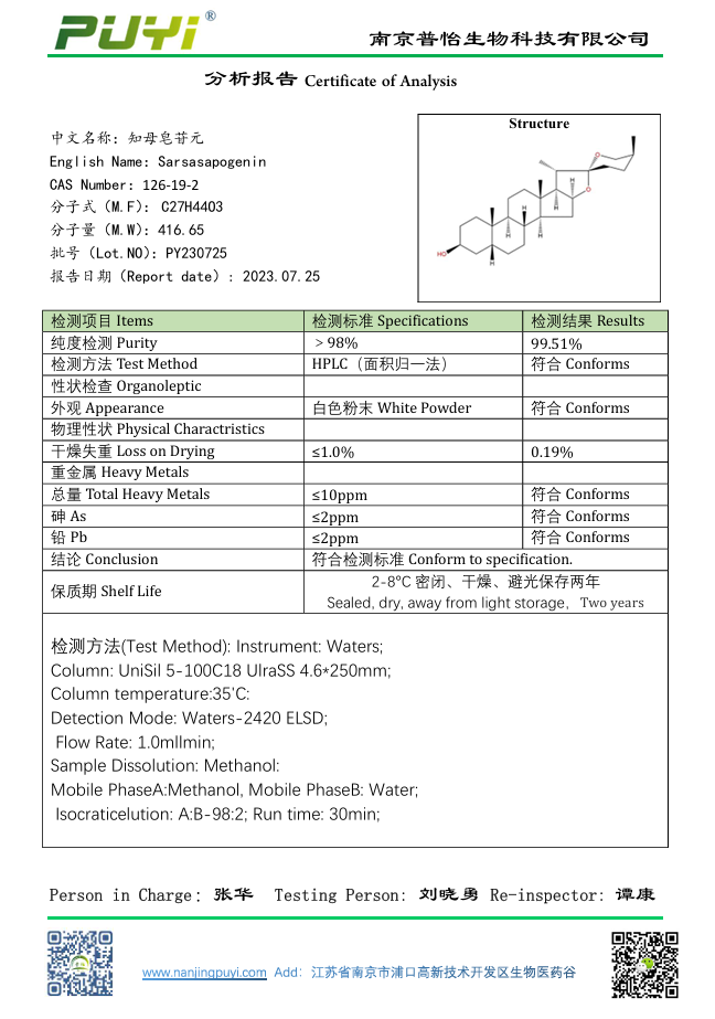 中文別名 菝葜皂苷元;菝葜皂甙元;菝契皂苷;薩灑皂草配基;菝契皂甙元;洋菝契皂甙元;莫哈弗絲蘭提取物;菝葜皂甙元: 知母皂苷元